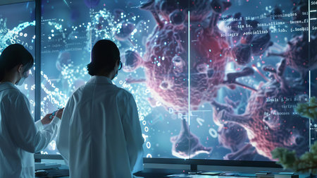 A medical team analyzing the genetic code of a virus on a giant interactive display, searching for a cure