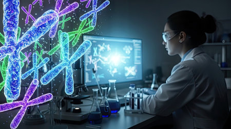 A scientist wearing protective eyewear examines genetic information displayed on a computer screen in a laboratory setting. The image features stylized representations of chromosomes with glowing effects. The scene is illuminated by cool lighting. Suitable for use in scientific publications, educational materials, and healthcare industry projects.