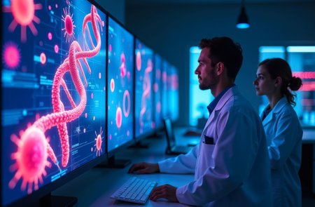 microbiologists man and woman in front of computer monitor in white coats, on display image of human DNA and virus, concept of studying microorganisms and viruses in biolaboratory