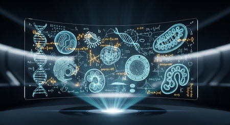 A curved holographic screen displays glowing scientific diagrams of DNA, cells, and molecules with equations.