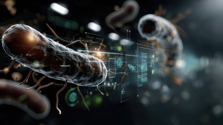 This image presents a detailed view of bacteria against a dark, high-tech background, featuring digital elements that emphasize scientific analysis and innovation.