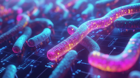 This abstract digital artwork showcases colorful bacteria and microbes, featuring glowing elements that create a modern and vibrant representation of microscopic life.