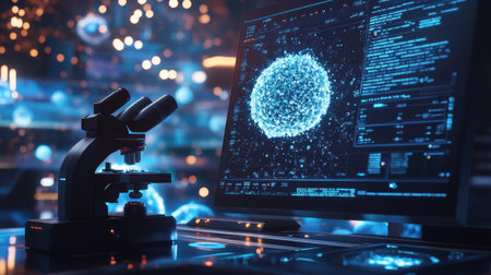 Digital microscope displaying enlarged cellular structures on a futuristic screen