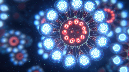 This image presents a close-up view of multiple, glowing circular shapes, each composed of a central red core surrounded by blue and white orbs. The composition uses a shallow depth of field, with soft lighting enhancing the textures of these forms against a dark background. It is suitable for scientific or illustrative purposes.