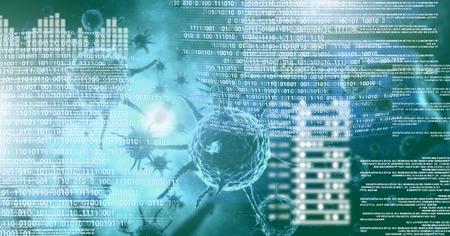 Image of cell and medical data processing over covid 19 cells. global coronavirus pandemic, medicine and healthcare concept digitally generated image.
