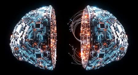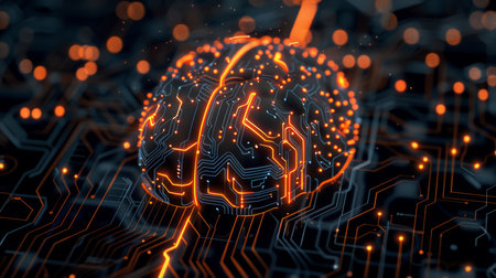 A detailed view of an advanced digital brain featuring neural network circuits and vibrant orange lights