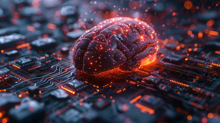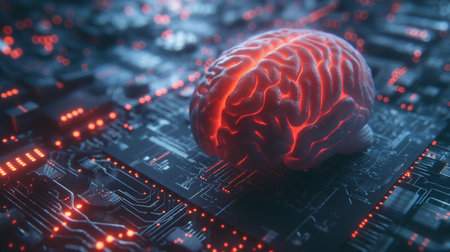 3d rendering of a brain sitting on a circuit board with red glowing lights, symbolizing the power of ai