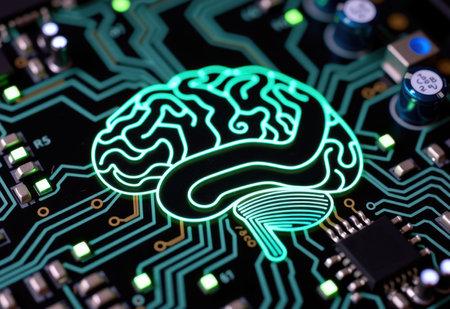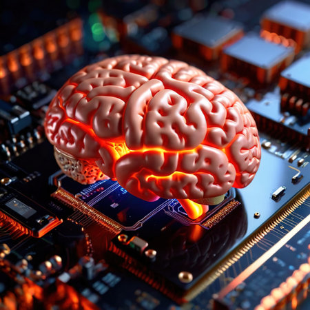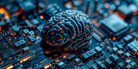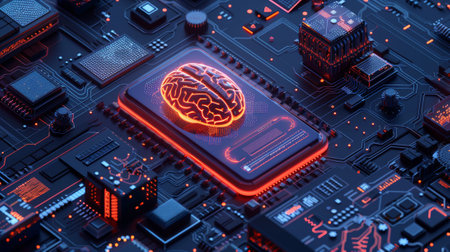 A colorful brain is prominently displayed on a circuit board, showing advanced technology and AI concepts.
