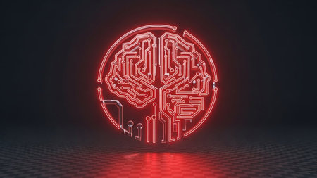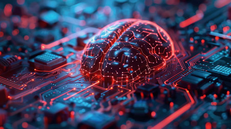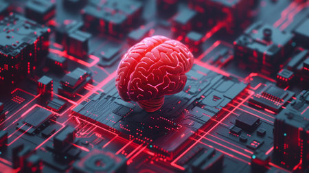 Red accents in a futuristic AI brain on a black circuit board