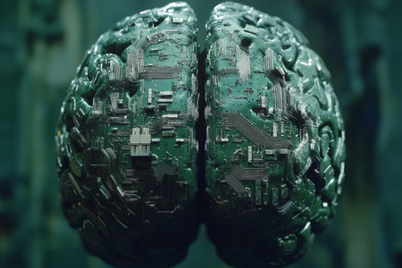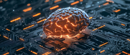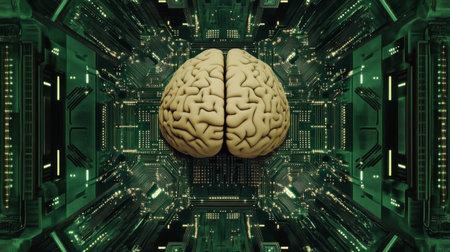 A stunning visual representation of a brain integrated with a circuit board, symbolizing the fusion of artificial intelligence and human cognition in a digital world.