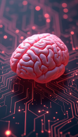 A vibrant pink brain rests on a luminous neon circuit pattern, symbolizing the intersection of technology and cognitive science in a modern and imaginative landscape.