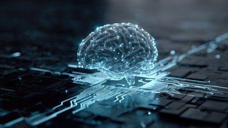 This striking image showcases a futuristic brain embedded with glowing circuits on a digital background, symbolizing the relationship between artificial intelligence and neural networking.
