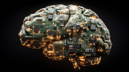 This captivating image showcases a brain composed of intricate circuit board elements, symbolizing the fusion of technology and neuroscience.