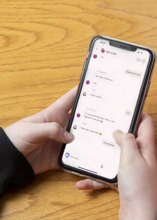 teenage schoochild being a cyber bully or being abused on social media text on phone , hand level copy space to the side