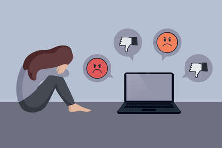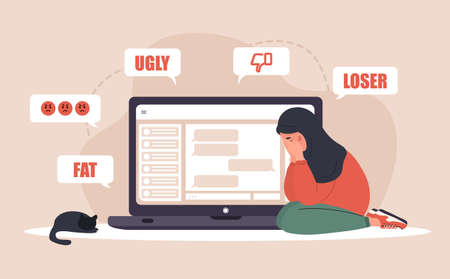 Cyber bullying. Sad arab woman with laptop receiving pop up messages. Online abuse concept. Teenager sitting on the floor and crying. Vector illustration in flat cartoon style