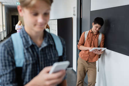 teenage boy using digital tablet near classmate with mobile phone on blurred foreground