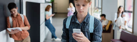 teenage boy using mobile phone near blurred classmates in school corridor, banner