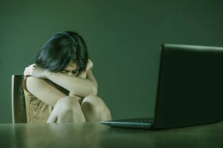 Asian teen girl bullied online . depressed and scared young woman with computer laptop suffering cyber bullying abused online by stalker or gossip students feeling humiliated and depressed
