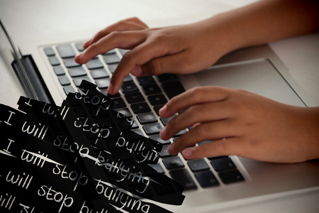 I will stop bullying text on black scribbling against schoolboy using laptop