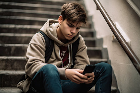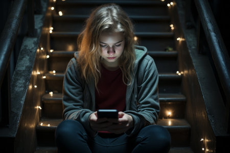 Teenager girl sitting on stairs with her smartphone beside her negative emotion. Generative Ai
