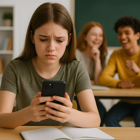 Closeup picture of frustrated girl, young woman being a victim of bullying online