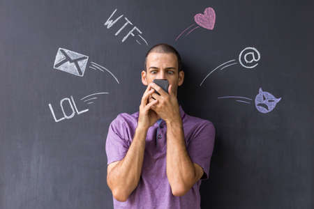 Concept of social media chat. Single white adult man standing in front of a blackboard using his smart phone.