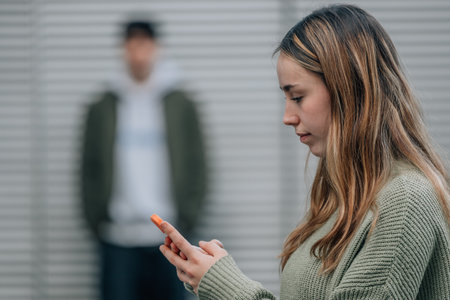 A girl looking at a cell phone and a concerned parent, symbolizing concern for online safety.