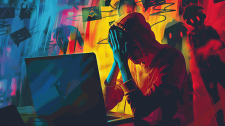A depressed woman sits on the floor, overwhelmed by sad social media posts and colorful background