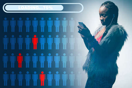 Personnel policy. HR. An African-American woman with a mobile phone in her hands. The hiring of new employees. Redundancy. The work of the personnel service. Selection of candidates for dismissal.