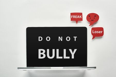 laptop with do not bully lettering on screen on white background near red speech bubbles with offensive words, cyberbullying concept