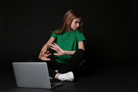 sad and scared female teenager with computer laptop suffering cyberbullying and harassment being online feeling desperate and humiliated in cyber bullying