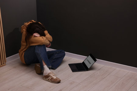 Cyber bullying. Upset teenage girl and laptop with text You Loser on floor indoors. Space for text