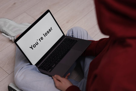 Cyber bullying. Upset teenage boy looking at laptop with text You Loser on floor indoors, closeup