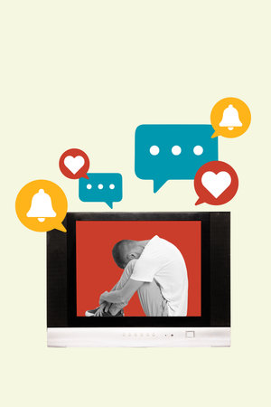Surreal collage showing sad man inside TV with surrounding bubbles and emotional social icons