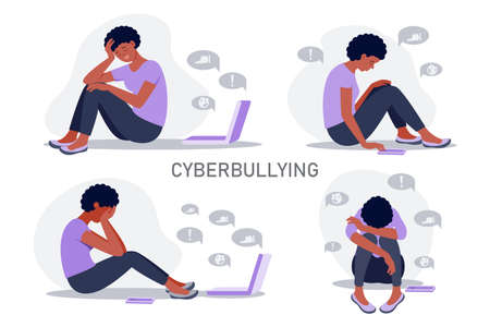 Set of depressed black woman sitting with phone in front of laptop screen surrounded by message bubbles. Cyber bullying in social networks and online abuse concept. vector flat cartoon illustration