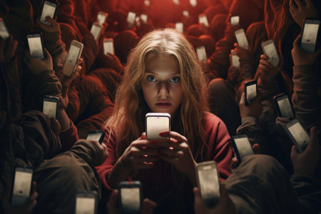 A woman is consumed by her phone. She is so focused on her phone that she is unaware of the world around her. The image is a warning about the dangers of addiction to technology