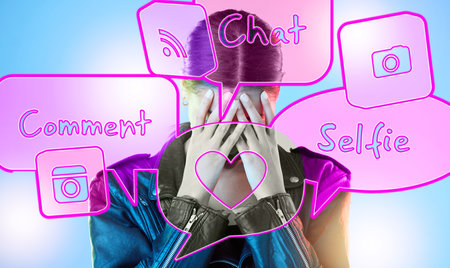 Sad face surrounded by likes and hearts from social networks. Chasing likes does not make you happy. Internet addiction, doomscrolling. Endorphin addiction. Emotional burnout in digital culture