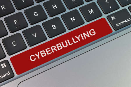 Layout of plastic tiles with text CYBER BULLYING and wooden tiles with texts of cyberbullying actions. Cyberbullying concept