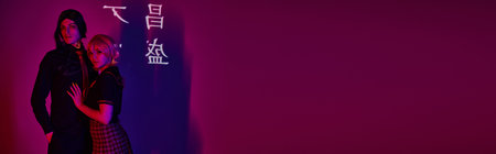 cosplay students in uniform in neon light on purple backdrop with hieroglyphs projection, banner