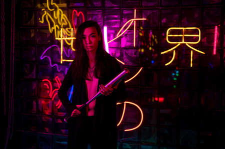 Male transgender neon light studio. Asian with samurai sword.