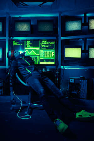 Rear view of computer hacker sitting and reading a computer code reflecting on his back
