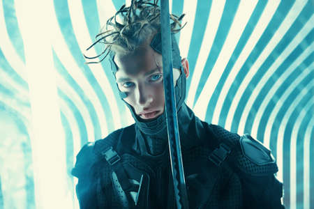 Virtual reality games. Portrait of a militant cybergirl standing on alert with a sword. Neon crimson blue lighting. Space tech style.
