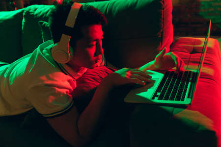 Concentrated young man looking at a laptop and typing in a room with colored lighting. High quality photo.