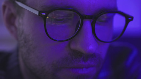Close-up of computer hacker in eyeglasses working with computer code reflecting in his eyeglasses