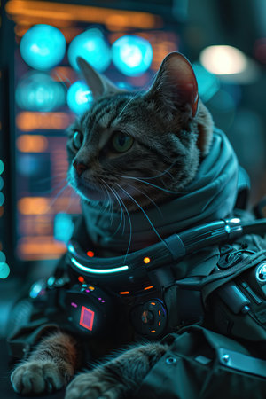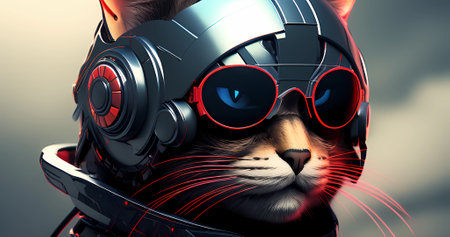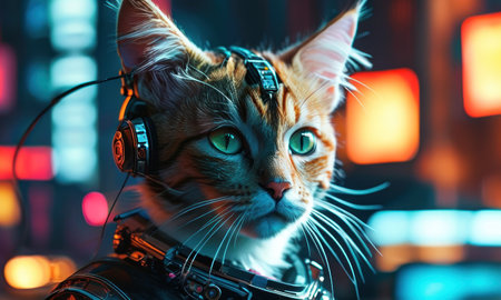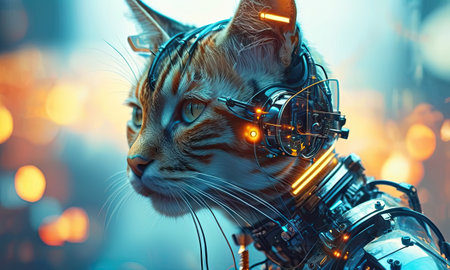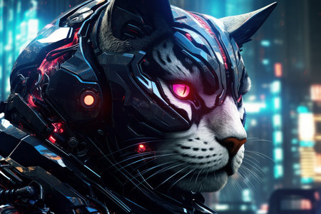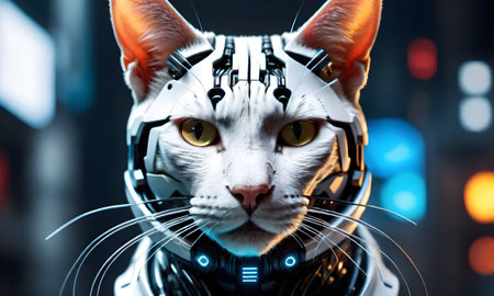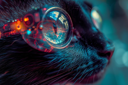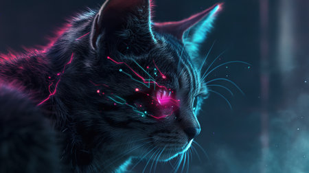 Closeup of a cat with cybernetic enhancements and glowing eyes, depicting futuristic concepts