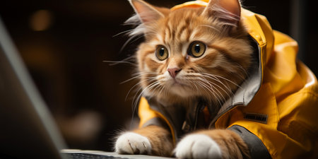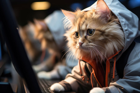 Cat wearing hoodie sitting on top of laptop computer. Generative AI.
