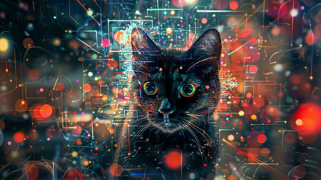 Futuristic Cat with Glowing Eyes Amidst Digital Network and Colorful Lights