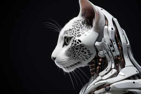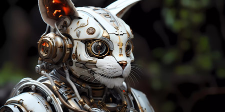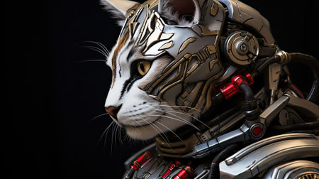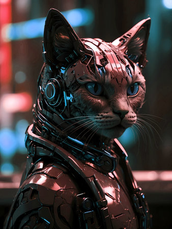 Portrait of a futuristic robot cat. An artistic abstract cyberpunk fantasy. Concept of a cyber cat. Generative AI