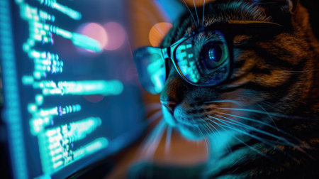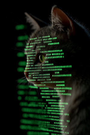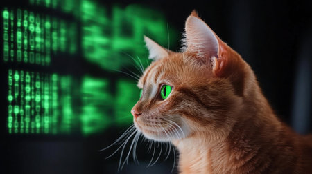 Stylized cyber cat with sharp green eyes analyzing matrix-like code