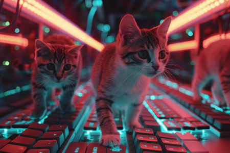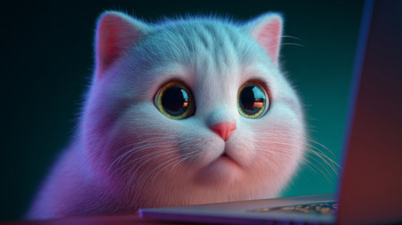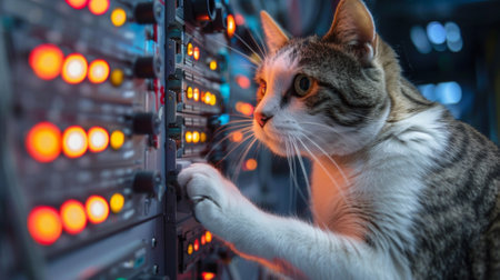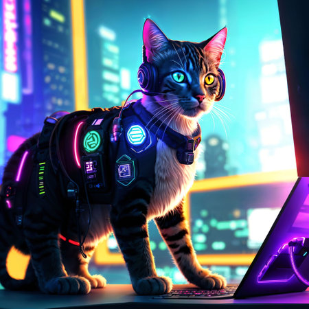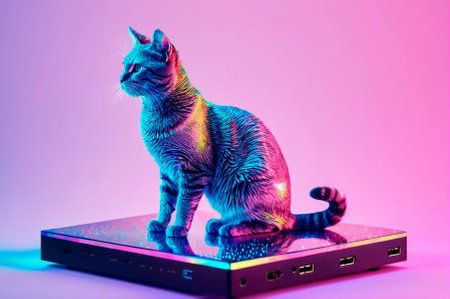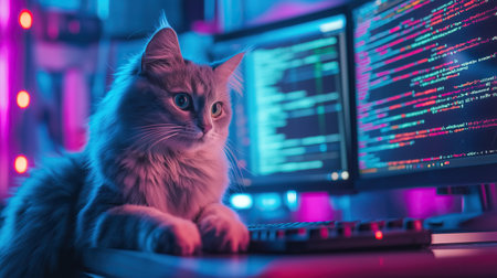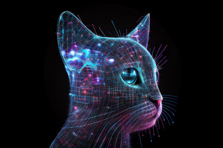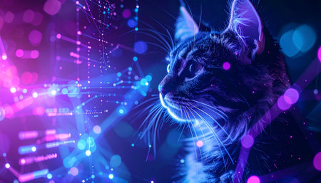 A curious cat gazes into a vibrant, glowing digital landscape, its silhouette illuminated by streams of data and neon lights. This image represents the intersection of nature and technology, symbolizing concepts like artificial intelligence, virtual exploration, and the future of connectivity.